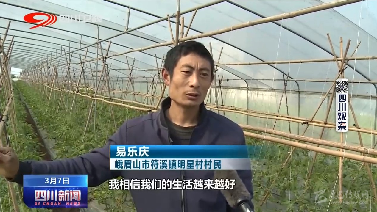 符溪鎮(zhèn)是峨眉山市的蔬菜生產基地,有大棚蔬菜種植面積近2萬畝。村民易樂慶和家人這幾天一直在蔬菜大棚里忙碌著。雖然今年受新冠肺炎疫情的影響,蔬菜的栽種時間比往年有所延遲,可看到已經掛果的小番茄,對未來的生活他充滿了信心。