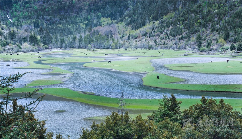 四川甘孜藏族自治州稻城縣濕地公園一景(6月17日攝,無人機照片)。新華社記者 尹恒 攝