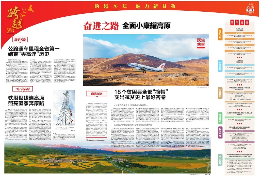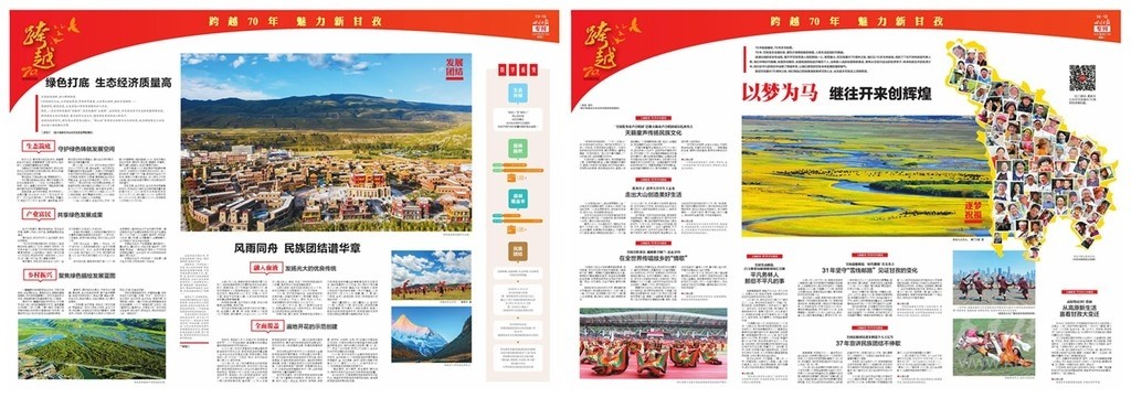 開(kāi)篇連版以手繪甘孜建州70周年10件大事記鋪底,部分金山、碉樓等民族元素做點(diǎn)綴。版面上有州委州政府的署名文章,還有川報(bào)首席記者所寫(xiě)《光輝歲月 砥礪奮進(jìn)》70年綜述,并鏈接二維碼,可通過(guò)手機(jī)掃碼看甘孜70年變遷。