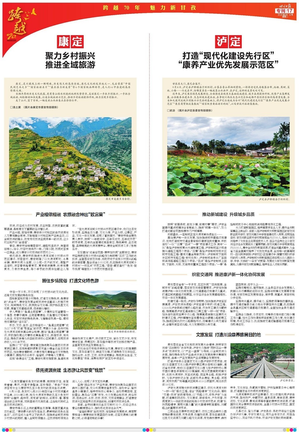 為慶祝甘孜建州70周年,《四川日?qǐng)?bào)》于9月15日推出八連版特別報(bào)道,整體以紅色打底,充滿喜慶的祝福。
