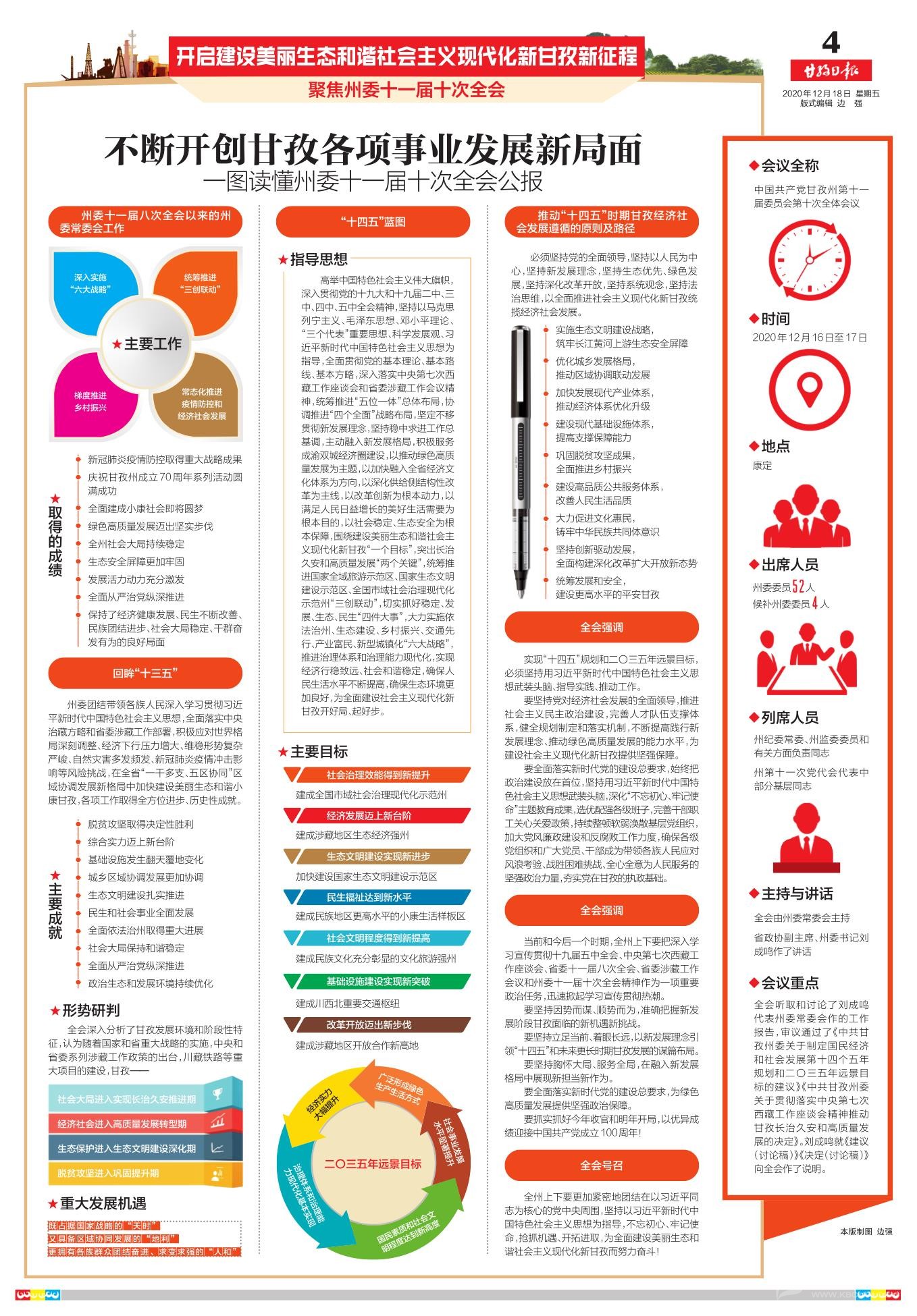 全會認(rèn)為,黨的十九屆五中全會、省委十一屆八次全會先后通過《中共中央關(guān)于制定國民經(jīng)濟(jì)和社會發(fā)展第十四個五年規(guī)劃和二〇三五年遠(yuǎn)景目標(biāo)的建議》《中共四川省委關(guān)于制定四川省國民經(jīng)濟(jì)和社會發(fā)展第十四個五年規(guī)劃和二〇三五年遠(yuǎn)景目標(biāo)的建議》,將“十四五”規(guī)劃與2035年遠(yuǎn)景目標(biāo)統(tǒng)籌考慮,為我州謀劃“十四五”時期經(jīng)濟(jì)社會發(fā)展提供了根本遵循、指明了前進(jìn)方向。中央第七次西藏工作座談會、省委涉藏工作會議明確了涉藏地區(qū)工作的指導(dǎo)思想、目標(biāo)任務(wù)、方針政策和戰(zhàn)略舉措。全州上下要深入貫徹落實黨的十九屆五中全會、中央第七次西藏工作座談會和省委十一屆八次全會、省委涉藏工作會議精神,全面學(xué)習(xí)貫徹習(xí)近平總書記關(guān)于西藏工作重要論述、新時代黨的治藏方略和省委涉藏工作部署,切實增強(qiáng)“四個意識”、堅定“四個自信”、做到“兩個維護(hù)”,找準(zhǔn)發(fā)展定位、找出問題短板、豐富戰(zhàn)略謀劃、完善對策措施,確保中央和省委精神在甘孜不折不扣落地落實。