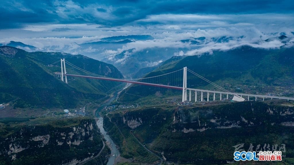 4月11日,雨后的瀘州市古藺縣的赤水河紅軍大橋在云霧中,大橋橫跨赤水河兩岸,連接川黔兩地,在連綿的烏蒙山中更加壯觀。赤水河大橋主橋跨徑1200米,為雙塔單跨鋼桁梁懸索橋,索塔采用門形框架鋼筋混凝土結(jié)構(gòu),貴州岸塔高243.5米,是世界山區(qū)峽谷同類型橋梁中第一高塔,同時也是國內(nèi)山區(qū)峽谷同類型橋梁第二跨度的鋼桁梁懸索橋。作為四川南向出川大通道,增強了川南、黔北、渝西等地的經(jīng)濟聯(lián)系。
