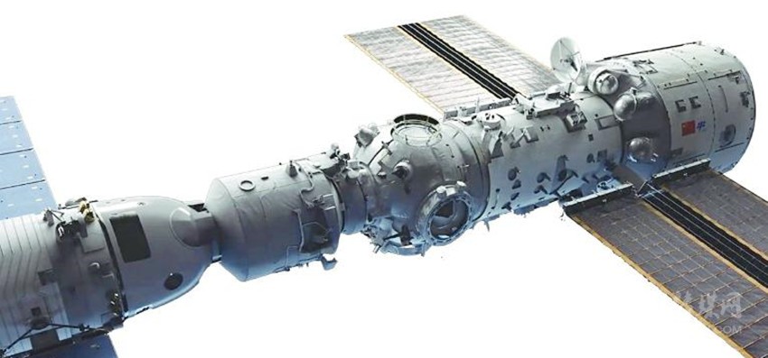 15時54分,飛船采用自主快速交會對接模式,成功對接于天和核心艙前向端口,與此前已對接的天舟二號貨運(yùn)飛船一起構(gòu)成三艙(船)組合體,歷時約6.5小時。
