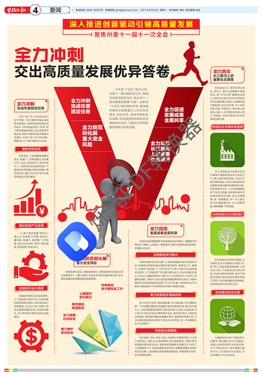 全會強調,當前和今后一個時期,全州上下要把深入學習宣傳貫徹黨的十九屆五中全會、中央第七次西藏工作座談會、中央民族工作會議、省委十一屆九次全會和州委十一屆十一次全會精神作為一項重要政治任務,圍繞建成川西北生態(tài)示范區(qū)綠色發(fā)展科技支撐體系,進一步發(fā)揮政策激勵作用、優(yōu)化創(chuàng)新管理服務、壓緊壓實工作責任,全力推動創(chuàng)新發(fā)展成勢見效。要全力沖刺完成年度既定任務,狠抓項目投資,加強經濟運行調度,加快推動優(yōu)勢產業(yè)發(fā)展;全力防范和化解重大安全風險,常態(tài)推進疫情防控,統(tǒng)籌推進各方面安全工作,全力促進發(fā)展成果全民共享,織密民生保障網;筑牢長江黃河上游重要生態(tài)屏障,堅定不移走生態(tài)優(yōu)先綠色發(fā)展之路。