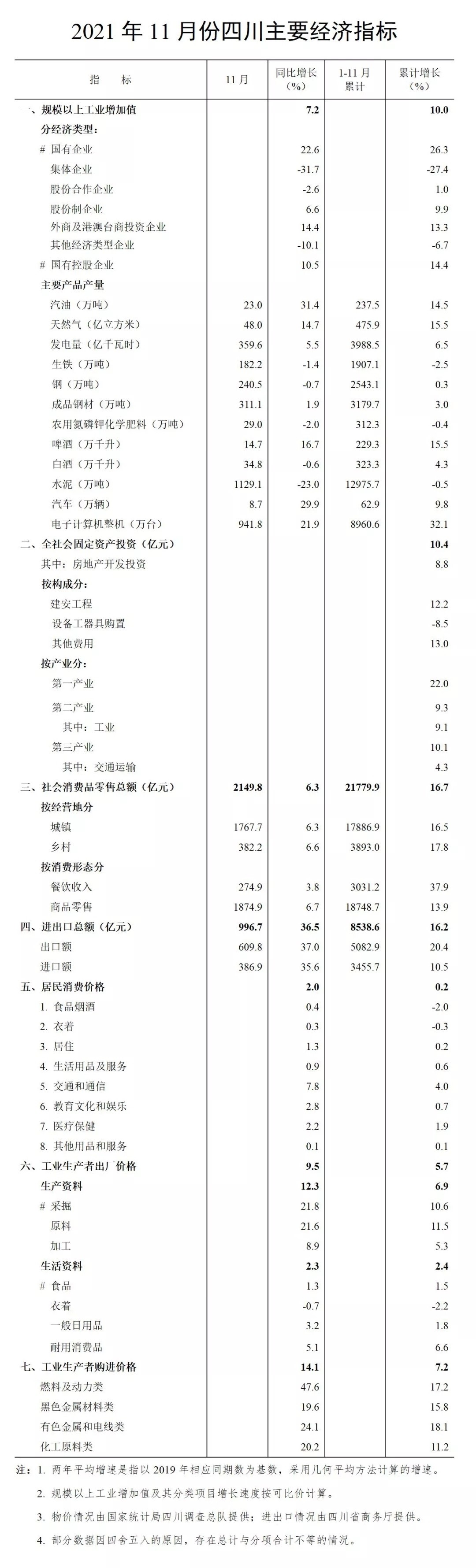 12月16日,四川省統(tǒng)計局官微發(fā)布《2021年1-11月四川省國民經(jīng)濟主要指標數(shù)據(jù)》,具體如下: