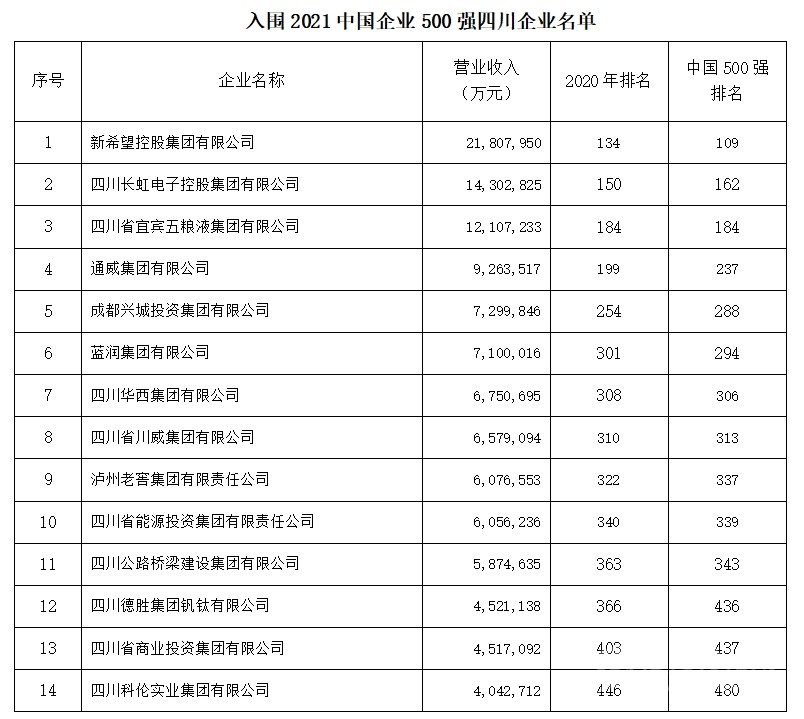 2021年四川有14家四川企業(yè)入圍中國企業(yè)500強,較上年減少1家。新希望控股集團有限公司以21,807,950萬元的營收成為進(jìn)入中國500強的四川企業(yè)首位,總排名109位,比去年上升25位。其余入圍企業(yè)名單如下。