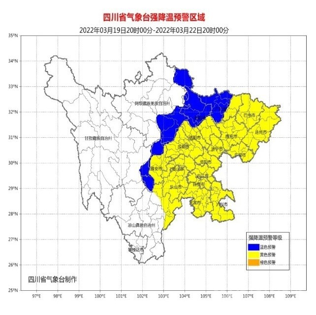 3月18日下午以來,四川省成都、南充、廣元、眉山、內(nèi)江、綿陽、雅安、遂寧、樂山、瀘州、資陽、眉山、宜賓13市都發(fā)布了強降溫黃色預(yù)警,德陽、巴中2市發(fā)布了強降溫藍色預(yù)警,廣安、內(nèi)江2市于3月19日升級發(fā)布了強降溫黃色預(yù)警。
