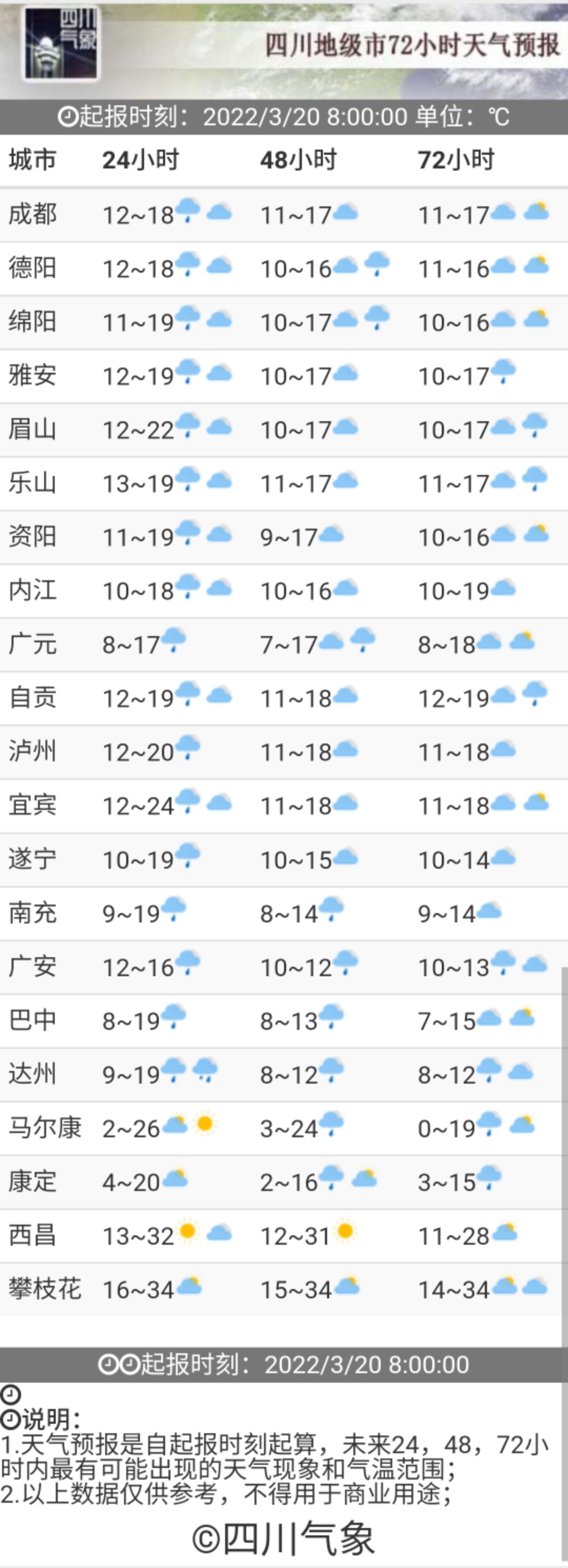 早在3月18日,四川省氣象臺便發(fā)出了強降溫黃色預(yù)警。預(yù)計19日傍晚~22日,盆地和涼山州東北部將有一次明顯的降溫降雨天氣過程,日平均氣溫將累計下降7~12℃,最高氣溫將下降15℃或以上;冷空氣影響時有3-5級偏北風(fēng),山口河谷風(fēng)力可達6級或以上,局部地方有短時強降水、雷暴大風(fēng)或冰雹等強對流天氣,其中盆地東北部、中部和南部有大雨到暴雨。