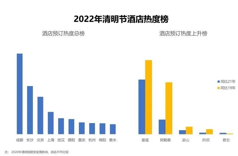 攜程數(shù)智酒店大數(shù)據(jù)出具的《2022年清明節(jié)預(yù)測報告》也顯示,2022年清明期間,在全國文旅市場遇冷的情況下,成都、長沙、北京的酒店生意預(yù)測相對較好,位居熱度榜單前三。眉山、阿壩、雅安等城市的酒店預(yù)訂熱度同比2021年上升明顯。