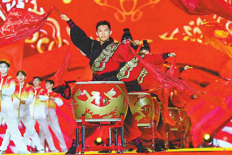 演員們擂鼓為運(yùn)動(dòng)健兒助威。