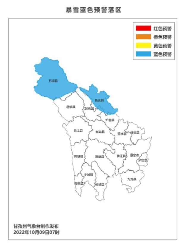 10月9日上午,甘孜州氣象臺發(fā)布了今年第一個(gè)暴雪藍(lán)色預(yù)警: