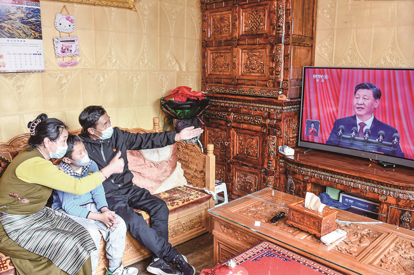 理塘縣高城鎮(zhèn)珍呷村洛絨青繞一家收看黨的二十大開幕會。