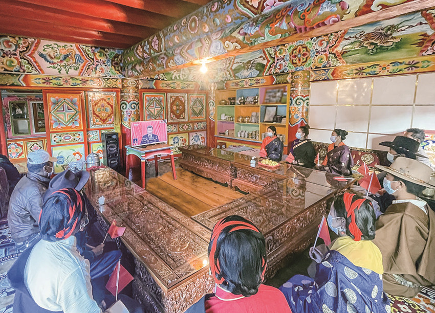 道孚縣麻孜鄉(xiāng)村民集中收看黨的二十大開幕會。