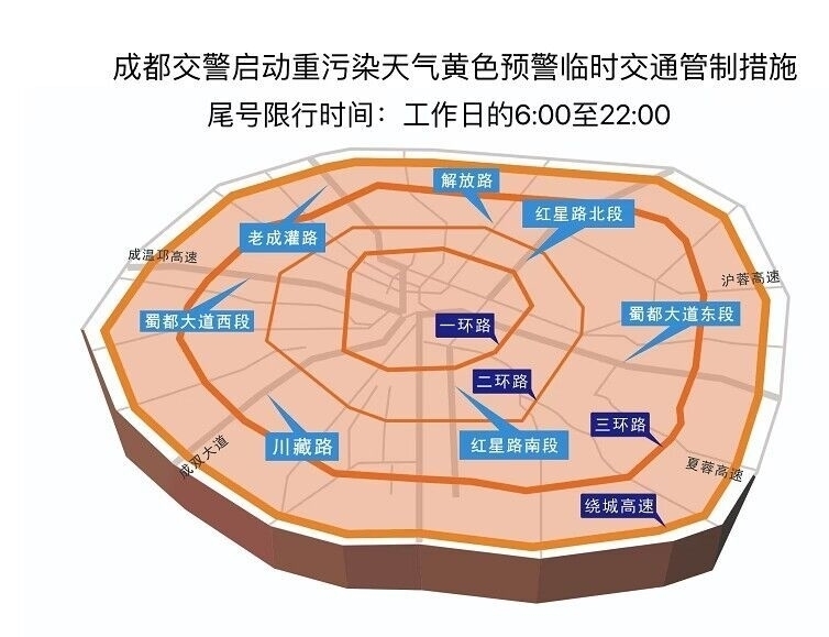 三、工作日的6:00至22:00,在四環(huán)路(成都繞城高速公路G4202,不含)以內區(qū)域道路,實行汽車尾號限行,按照機動車號牌(含臨時號牌汽車)的最后一位阿拉伯數(shù)字尾號限行。即:星期一限尾號“1”和“6”,星期二限尾號“2”和“7”;星期三限尾號“3”和“8”;星期四限尾號“4”和“9”;星期五限尾號“5”和“0”。公休日因法定節(jié)假日調休為工作日的,不限行。