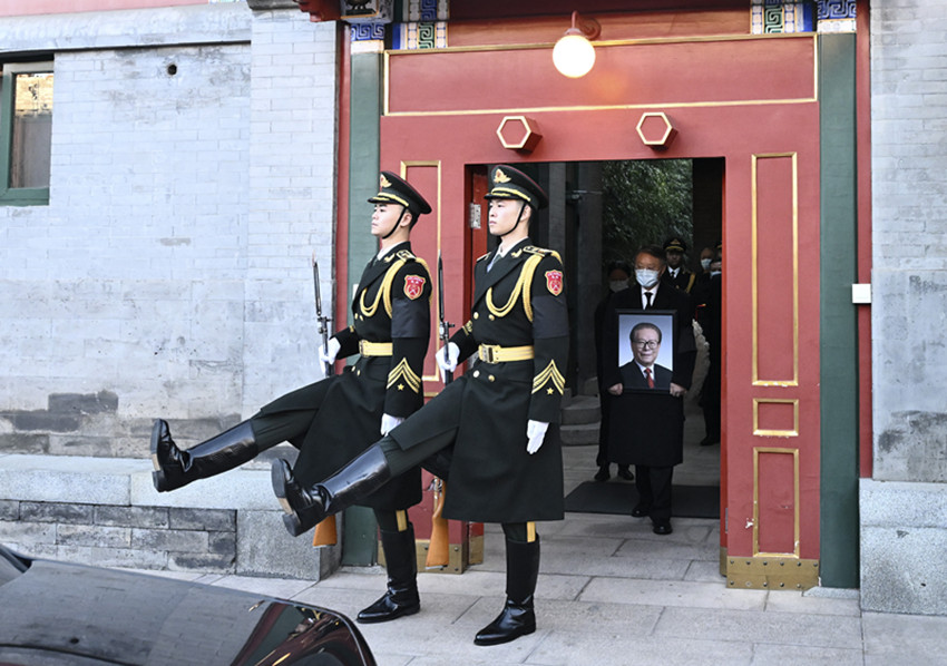今天上午,江澤民同志生前長期工作的中南海下半旗志哀。來福堂里,白色的幕布上,懸掛著江澤民同志的彩色遺像。遺像下方,擺放著江澤民同志的骨灰盒,上面覆蓋著鮮紅的中國共產黨黨旗。江澤民同志的夫人王冶坪率全家敬獻的花籃擺放在江澤民同志的骨灰盒前,兩側擺放著其他親屬和有關方面敬獻的花圈。