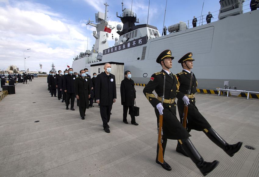 中國人民解放軍海軍揚州艦伏波靜臥,艦上官兵分區(qū)列隊、肅立舷邊。揚州是江澤民同志的故鄉(xiāng)。今天,這艘以揚州命名的軍艦,以最高禮儀送別這位為黨和人民建立了不朽功勛的卓越領導人。江澤民同志的親屬捧護著骨灰登上揚州艦。海軍笛吹響,儀仗隊持槍肅立,行注目禮。當揚州艦起航時,軍港內所有艦船汽笛長鳴,響徹云霄。