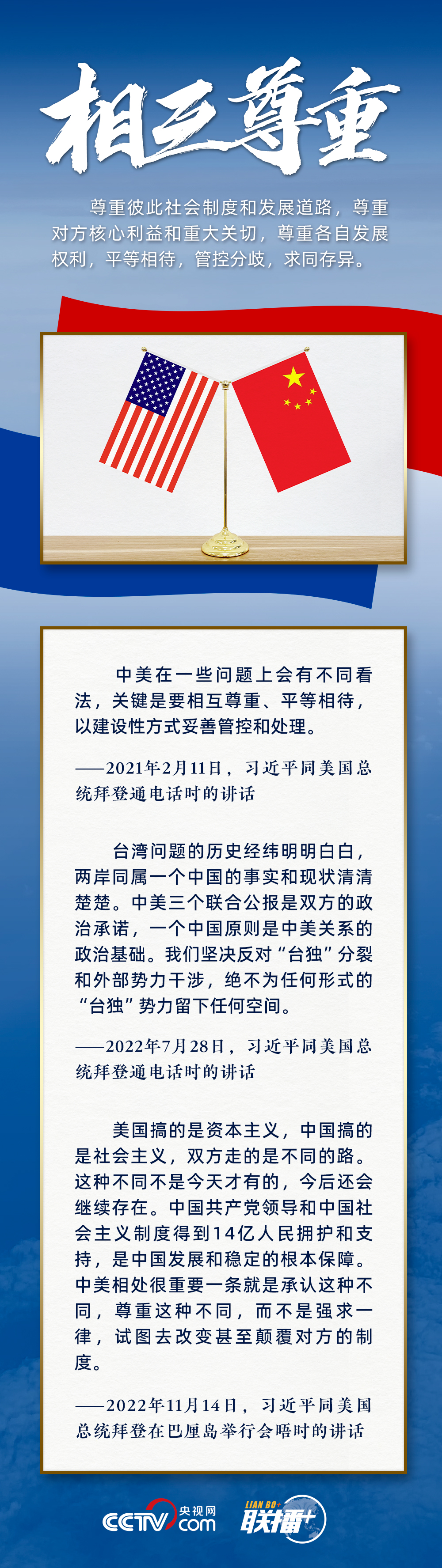 “中美不沖突、不對抗、和平共處,這是兩國最基本的共同利益?!绷?xí)主席指出,遵守國際關(guān)系基本準(zhǔn)則和中美三個聯(lián)合公報,這是雙方管控矛盾分歧、防止對抗沖突的關(guān)鍵,也是中美關(guān)系最重要的防護(hù)和安全網(wǎng)。
