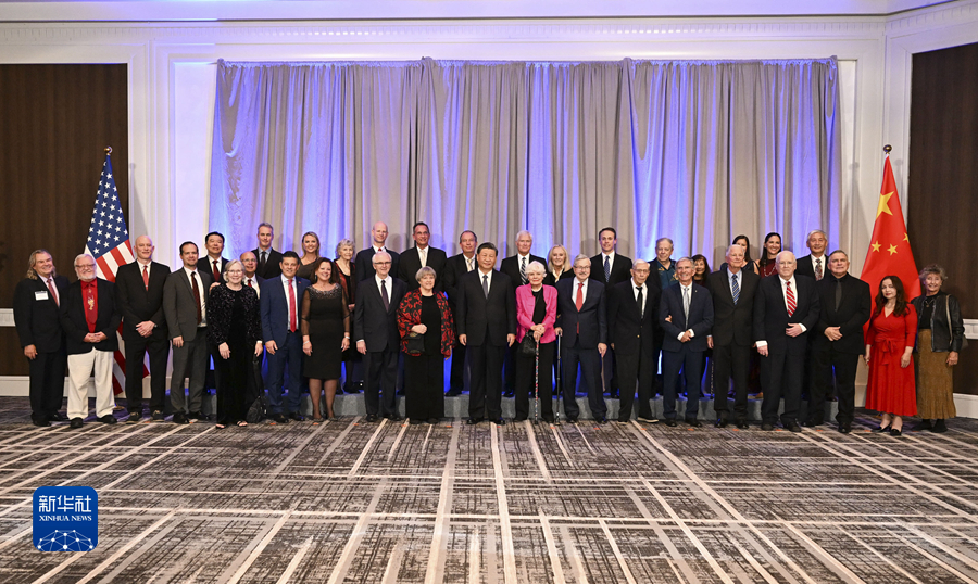 當?shù)貢r間11月15日晚,國家主席習近平在美國舊金山出席美國友好團體聯(lián)合舉行的歡迎宴會。這是宴會開始前,習近平會見飛虎隊和史迪威將軍后人、鼓嶺、艾奧瓦州、華盛頓州等方面友好人士代表,同他們親切交談并合影留念。新華社記者 謝環(huán)馳 攝 圖片來源:新華網(wǎng)