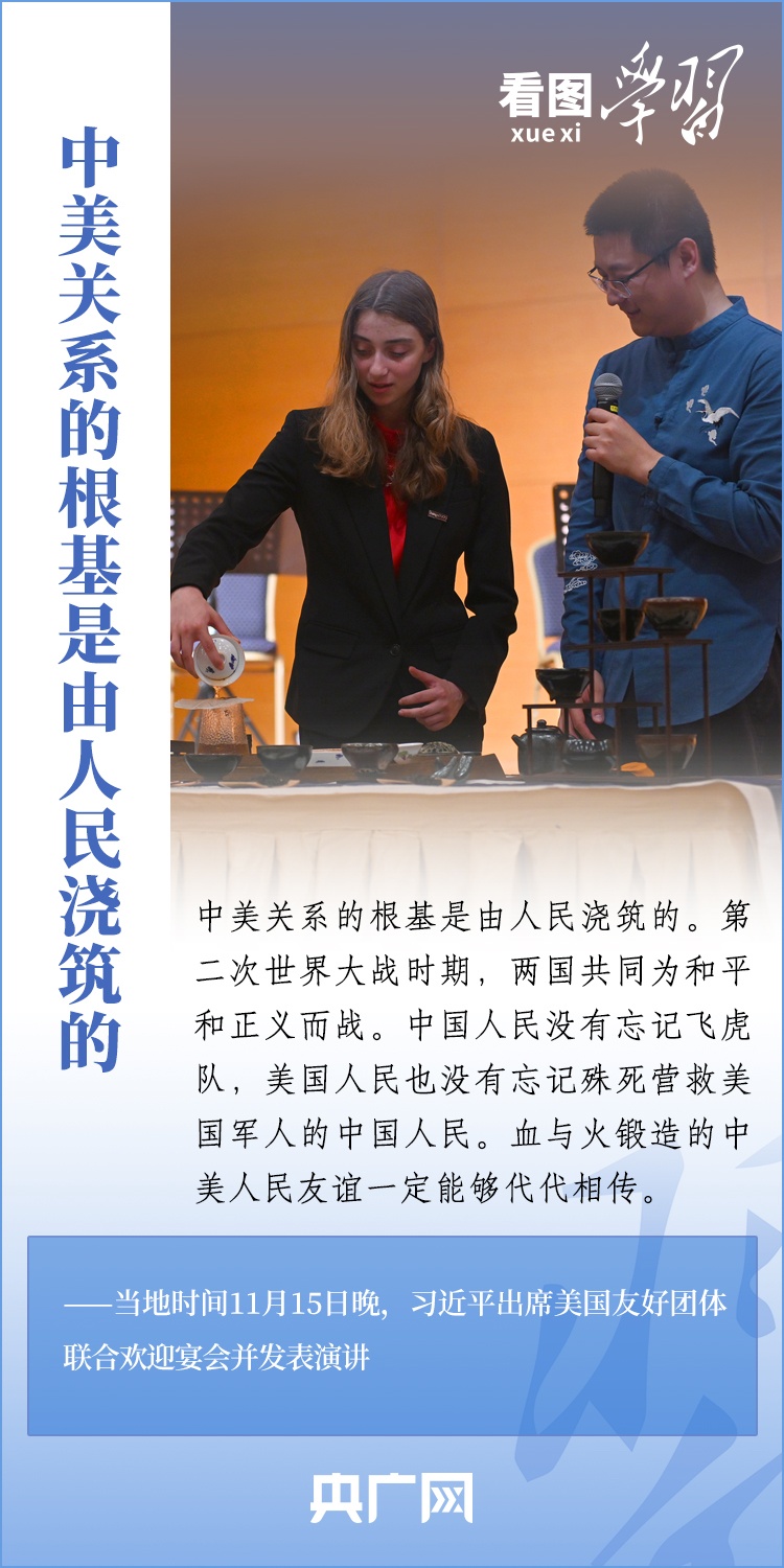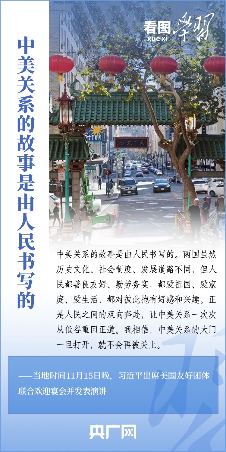 當(dāng)?shù)貢r間11月15日晚,國家主席習(xí)近平在美國舊金山出席美國友好團(tuán)體聯(lián)合舉行的歡迎宴會并發(fā)表重要演講。習(xí)近平主席在演講中系統(tǒng)闡述了關(guān)于中美關(guān)系的一系列觀點、立場、原則,強(qiáng)調(diào)“中美關(guān)系希望在人民,基礎(chǔ)在民間,未來在青年,活力在地方”,希望匯聚起兩國人民的力量,賡續(xù)中美友誼,推進(jìn)中美關(guān)系,努力為促進(jìn)世界和平和發(fā)展作出更大貢獻(xiàn)!一起來學(xué)習(xí)。