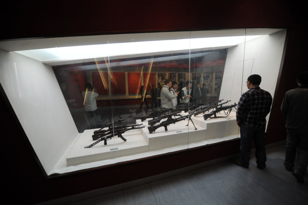 ↑ 觀眾在鹽城新四軍紀(jì)念館內(nèi)參觀槍支等實物展品(2011年5月26日攝)。