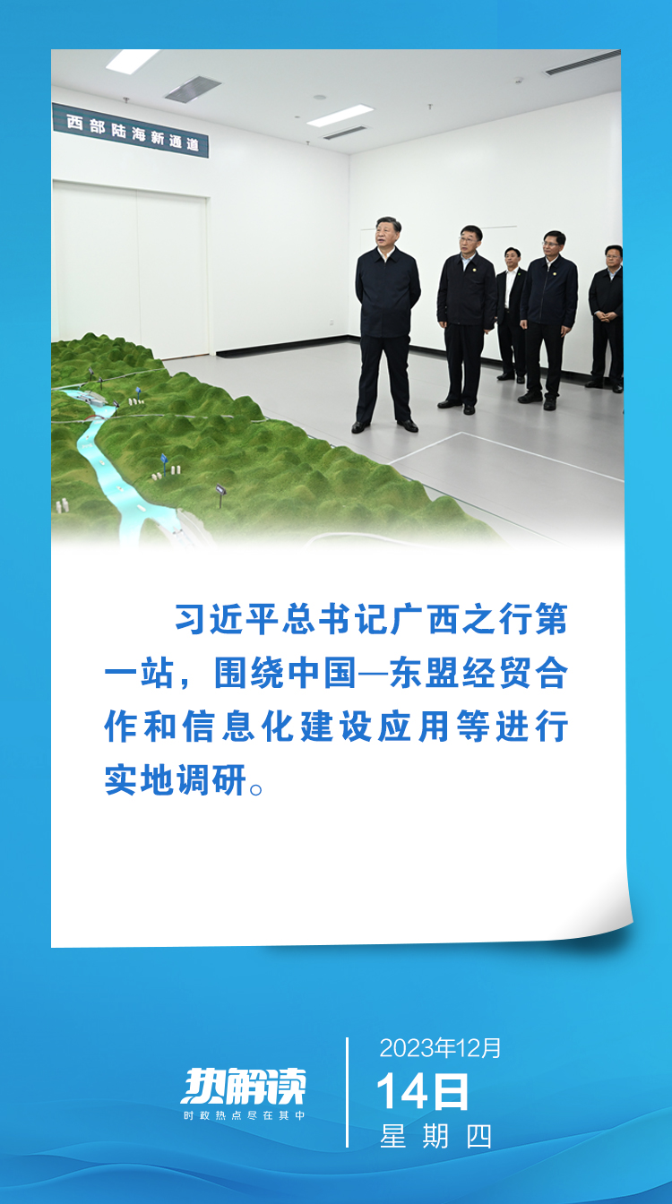 熱解讀12月14日,結(jié)束越南出訪回國后,習(xí)近平總書記在廣西考察。第一站,他走進(jìn)中國—東盟信息港股份有限公司,圍繞中國—東盟經(jīng)貿(mào)合作和信息化建設(shè)應(yīng)用等進(jìn)行實(shí)地調(diào)研。