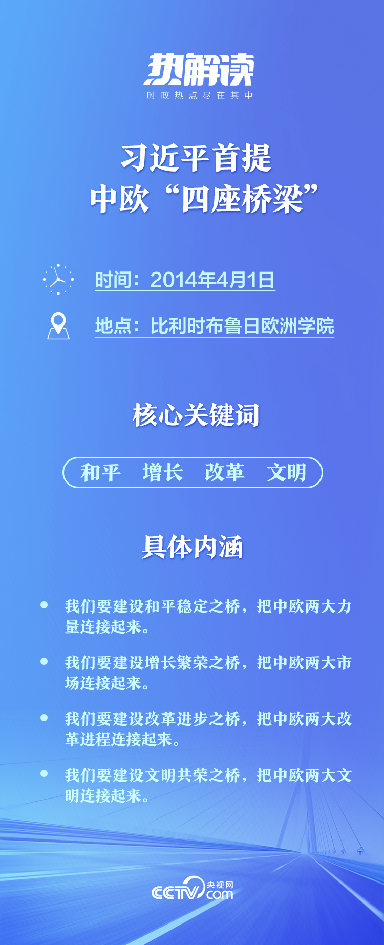 “我們要共同努力建造和平、增長、改革、文明四座橋梁,建設(shè)更具全球影響力的中歐全面戰(zhàn)略伙伴關(guān)系。”