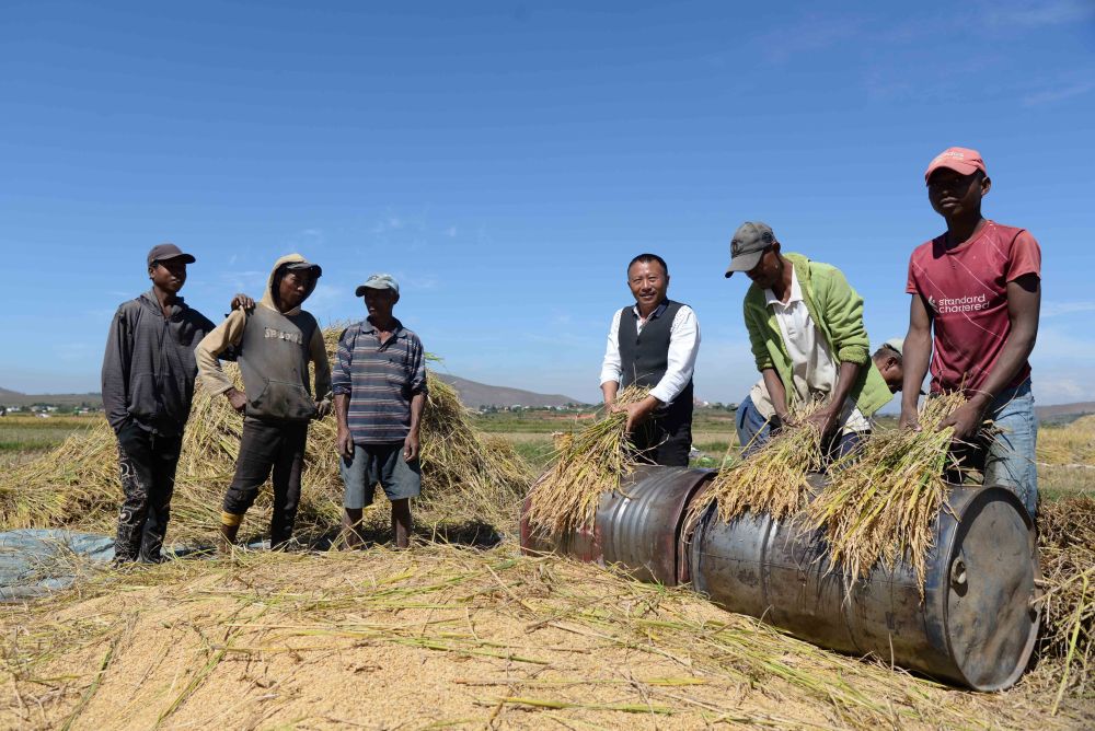 在馬達加斯加首都塔那那利佛附近的馬義奇鎮(zhèn),中國雜交水稻技術(shù)專家胡月舫(右三)在中國國家雜交水稻工程技術(shù)研究中心非洲分中心的試驗田里和當?shù)剞r(nóng)民一起收獲水稻(2023年5月12日攝)。新華社發(fā)(西塔卡·拉喬納里松攝)