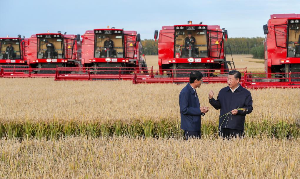 2018年9月25日,金秋時(shí)節(jié),稻浪滾滾,黑龍江農(nóng)墾建三江管理局七星農(nóng)場(chǎng)萬(wàn)畝大地號(hào)豐收在望。習(xí)近平總書(shū)記走進(jìn)正在收割的地塊,拿著稻穗,同工作人員交談,詳細(xì)了解糧食生產(chǎn)和收獲情況。