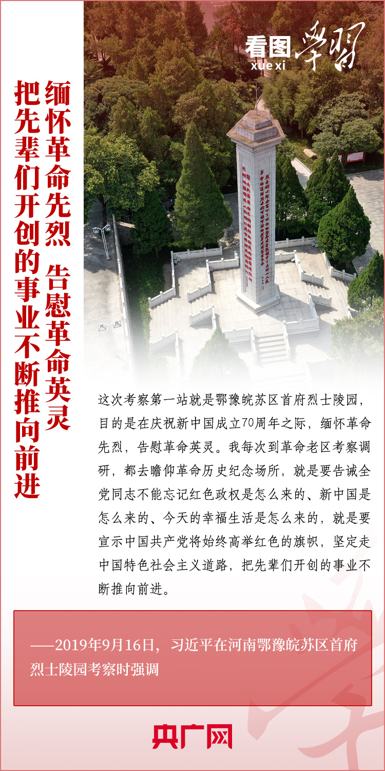 緬懷革命前輩,告慰先烈英靈。黨的十八大以來,習(xí)近平總書記多次在重大活動(dòng)、赴地方調(diào)研時(shí),或深情追憶革命前輩、英雄烈士,或向革命紀(jì)念場館禮敬鮮花、關(guān)心看望英烈親屬??倳浢銊?lì)大家要繼承革命先烈遺志,把他們流血犧牲打下的紅色江山守護(hù)好、建設(shè)好,以實(shí)現(xiàn)中華民族偉大復(fù)興來告慰革命前輩和先烈。