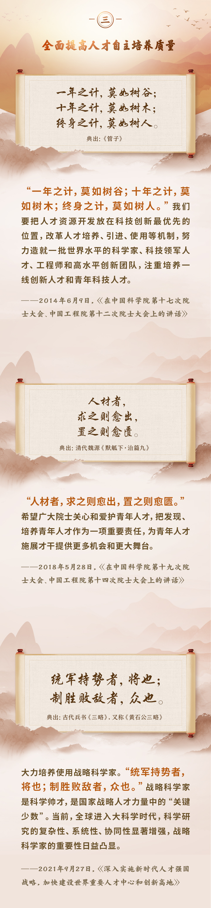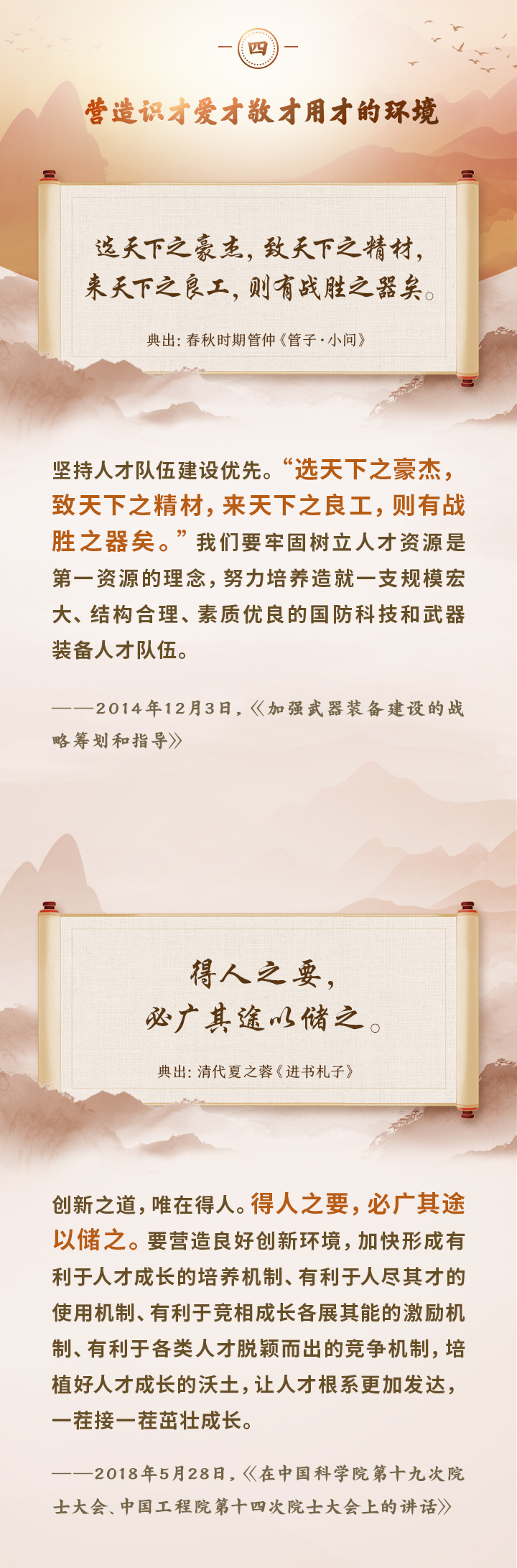 編者按:培養(yǎng)造就大批德才兼?zhèn)涞母咚刭|人才,是國家和民族長遠發(fā)展大計。黨的十八大以來,習近平總書記圍繞人才工作發(fā)表一系列重要論述,立意高遠,內涵豐富,思想深刻,深刻回答了為什么建設人才強國、什么是人才強國、怎樣建設人才強國的重大理論和實踐問題。在這些重要論述中,總書記精妙運用古代典籍、經典名句,以古喻今、啟迪思想、激蕩精神,讓我們一起來學習!
