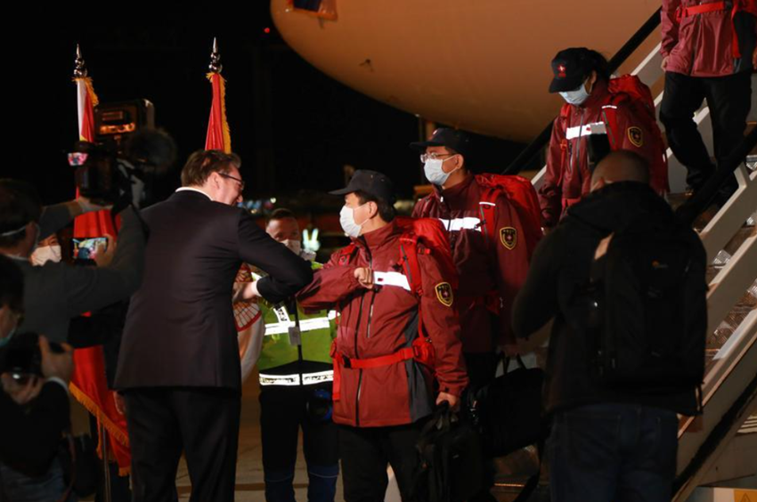 中國醫(yī)療團隊在貝爾格萊德尼古拉·特斯拉機場降落時已是深夜。武契奇率領(lǐng)塞方多名高級官員到機場迎接。疫情期間不建議握手,于是這位塞爾維亞領(lǐng)導(dǎo)人選擇和中國專家團成員一一碰肘以示尊重。對中國的及時支援心懷感激,他還在機場親吻了一面五星紅旗。