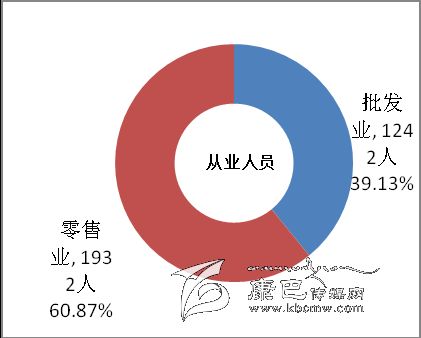 在批發(fā)和零售業(yè)企業(yè)法人單位中,批發(fā)業(yè)占27.45%,零售業(yè)占72.55%。在批發(fā)和零售業(yè)企業(yè)法人單位從業(yè)人員中,批發(fā)業(yè)占39.13%,零售業(yè)占60.87%(詳見表3-1)。