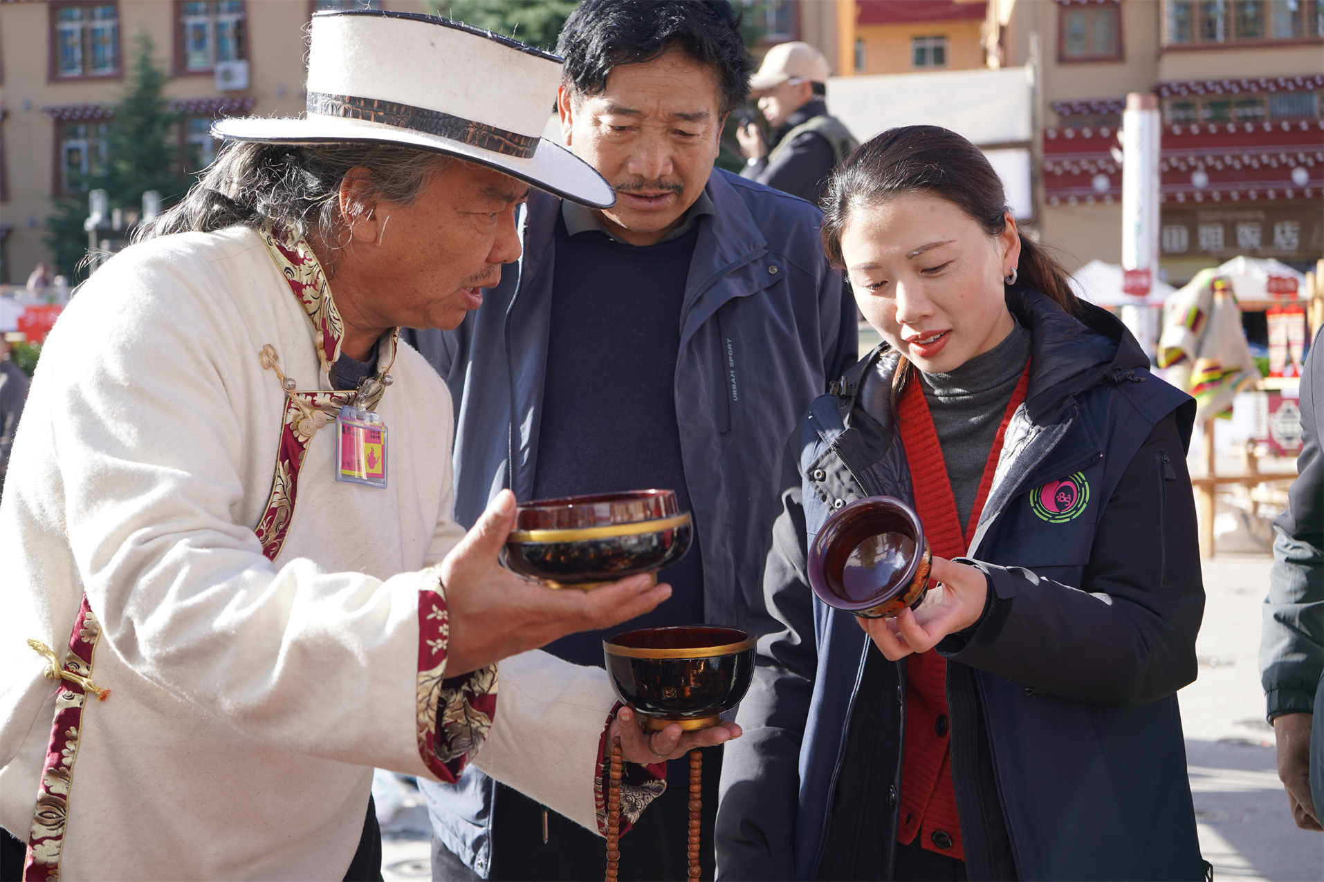 “馬幫馱貨、商人買賣。這個集市太有意思了!”游客李小姐正在挑選手工木碗,感慨到:“現(xiàn)在手工藝品太少了!今天在這里看見了好多好東西?!奔猩喜毓?、唐卡、編花等一件件精美的民藝作品如同無聲的詩篇,訴說著古老的故事與傳承的力量。色彩斑斕的扎染,以其獨(dú)特的圖案和變幻的色彩,展現(xiàn)出與藝術(shù)的完美融合;精巧的木雕,在藝人的刻刀下,仿佛被賦予了生命變得靈動……