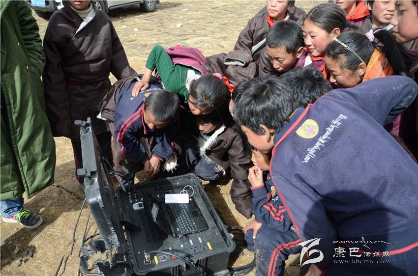 孩子們圍坐在國家電網(wǎng)四川電力公司前的便攜式衛(wèi)星通訊設(shè)備,與另一方連線的人進(jìn)行視頻聊天。