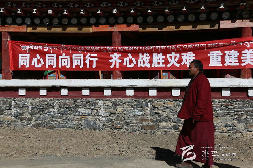 記者注意到,在金龍寺大門處的圍墻上貼著一面寫有“同心同向,共渡難關(guān),重建家園”的紅色橫幅,一位僧人口中念念有詞,走過(guò)橫幅,向新搭建的救災(zāi)帳篷走去,另一位僧人則拿著一柄鋤頭走出寺院大門,隨同另一批救災(zāi)人員去處理前幾日垮塌在地的石頭。