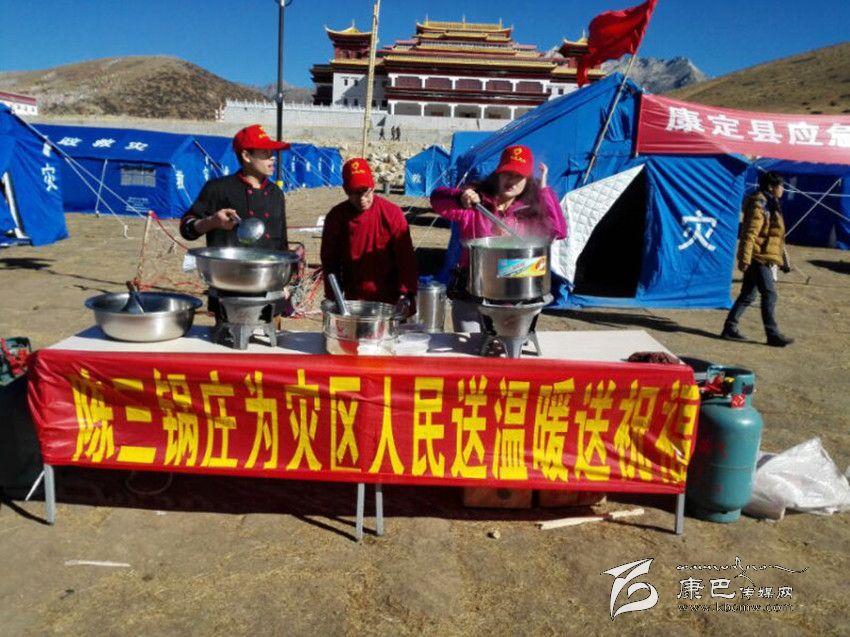 11月28日中午,記者來到康定塔公鎮(zhèn)祖慶小學采訪。在現(xiàn)場,一群戴著紅帽子的人正在將熱氣騰騰的紅燒肉一勺一勺的分發(fā)到同學們碗中。仔細一看,現(xiàn)場還有一幅標語,上面寫著“陳三鍋莊為災區(qū)人民送溫暖送祝福”的字樣。記者揉了揉眼,確定沒看錯。原來,陳三鍋莊是關(guān)了康定的門店,組織人員到災區(qū)參與抗震救災來了。