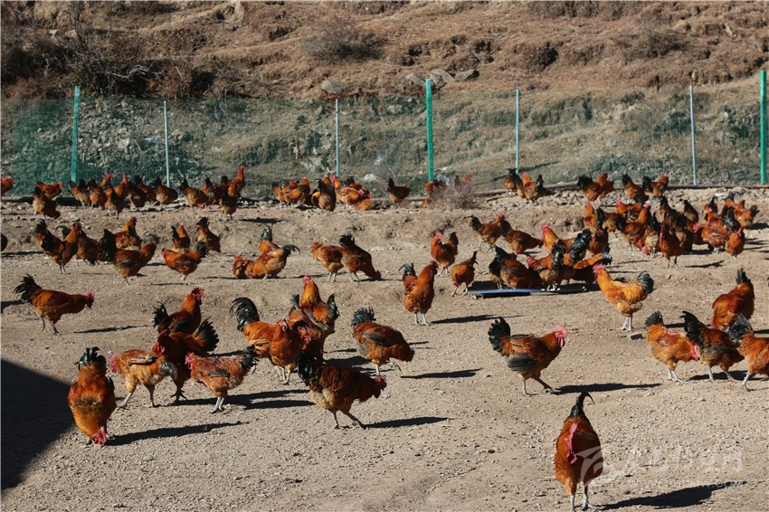 雄雞啼鳴鬧山谷,灣地溝村喜脫貧。12月9日上午10時(shí)許,當(dāng)記者沿著通村水泥路來(lái)到距雅江縣城20多公里的呷拉鎮(zhèn)灣地溝村紅標(biāo)雞生態(tài)養(yǎng)殖基地時(shí),只見(jiàn)冬日暖陽(yáng)下的洼谷山半山坡上,成群結(jié)隊(duì)的大紅公雞正在樹(shù)林下或覓食或展翅或歡歌。飼養(yǎng)員告訴記者:“別小看這3000多只活潑可愛(ài)的跑山雞,那可是村民心中的‘財(cái)富金雞’!”