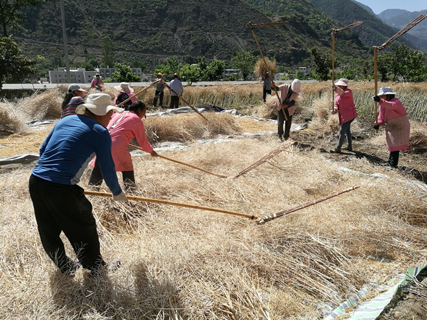 本網(wǎng)訊(尼胡克布 李娟 文/圖)5月12日,在瀘定縣德威鄉(xiāng)下河壩村農(nóng)田里,村民李永強(qiáng)正組織親戚朋友20余人,對(duì)自家3畝多油菜進(jìn)行搶收。村民們有的負(fù)責(zé)把一捆捆曬干的油菜抱到油布上,有的負(fù)責(zé)用農(nóng)具進(jìn)行打籽,現(xiàn)場一派繁忙的景象。