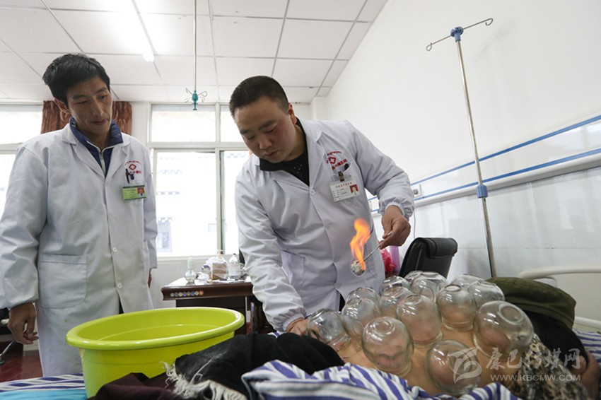 王利洪(右)在輔導學生扎西澤仁(左)給患者拔火罐。