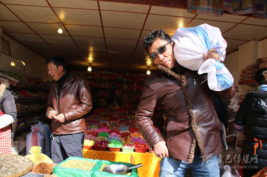 走進(jìn)郭達(dá)橋重康糖果店,洛讓說(shuō):“多買(mǎi)點(diǎn)糖果糕點(diǎn),娃娃老婆喜歡?!比缓笳諉吸c(diǎn)貨:花生10斤、瓜子5斤、葡萄干5斤、水果糖5斤、軟糖5斤、炒米糖10斤……一下就指點(diǎn)了八九種糖果糕點(diǎn)??吹搅诉@樣的生意,老板樂(lè)開(kāi)了花。與洛讓大包大攬的氣派不同,長(zhǎng)期經(jīng)商的扎西老練地詢價(jià):“老板,我們買(mǎi)這么多,要優(yōu)惠喲。”一番討價(jià)還價(jià)之后,洛讓和扎西買(mǎi)了十種糖果,用去1066元,裝滿整整兩編織袋。洛讓把糖果過(guò)扛在肩上,對(duì)筆者說(shuō):“你來(lái)試一下,有點(diǎn)分量,你別說(shuō),辦年貨也是一種體力活喲?!?/p>