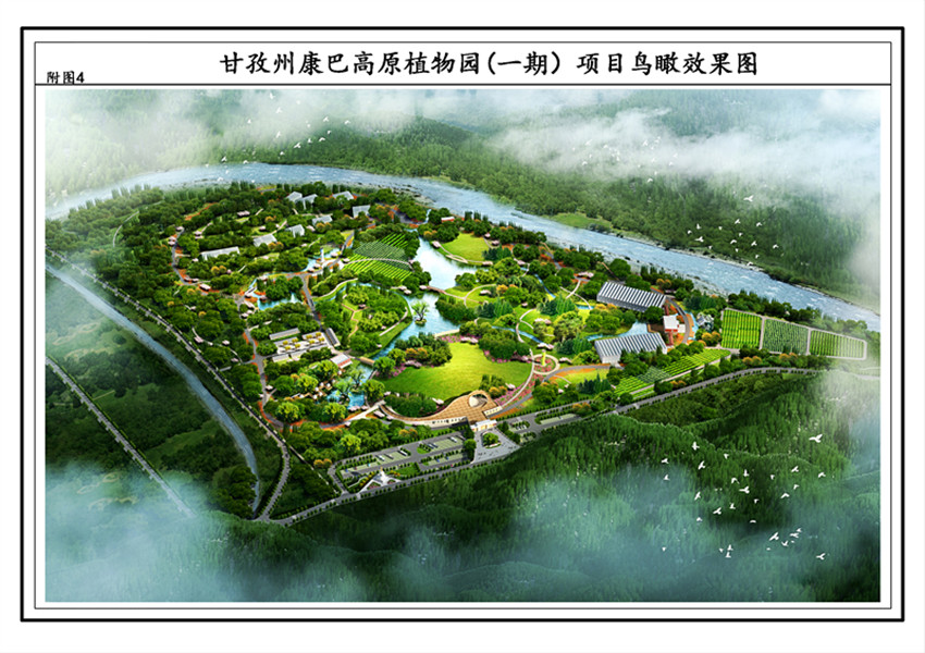 甘孜州康巴高原植物園(一期)項目鳥瞰效果圖。