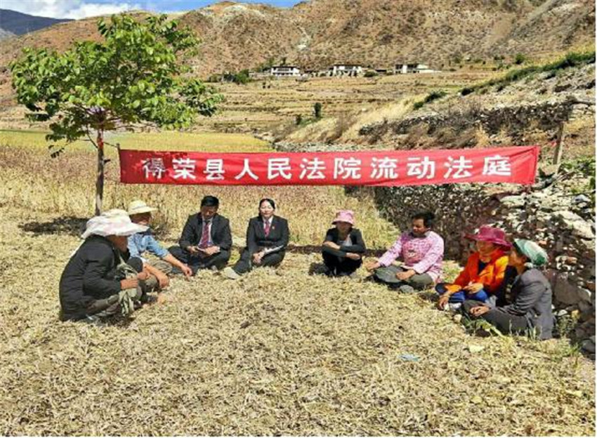 在曲雅貢鄉(xiāng)二號壩村進(jìn)行法律宣講時,村民澤某請求法院判決其和丈夫扎某離婚,“流動法庭”法官立即在田間地頭組織調(diào)解。調(diào)解過程中當(dāng)事人情緒抵觸、相互埋怨,尤其涉及到財(cái)產(chǎn)分割和子女撫養(yǎng)等問題時情緒波動大,場面一度僵持。法官憑借豐富的調(diào)解經(jīng)驗(yàn),先從講解相關(guān)法律規(guī)定入手,告知當(dāng)事人享有的權(quán)利義務(wù),而后對離婚財(cái)產(chǎn)分割、子女撫養(yǎng)問題從情理法多角度層層剖析,促使雙方達(dá)成和解協(xié)議,有效化解了矛盾?!傲鲃臃ㄍァ币孕僬{(diào)、以案說法,達(dá)到了審理一案、教育一片、穩(wěn)定一方的效果。