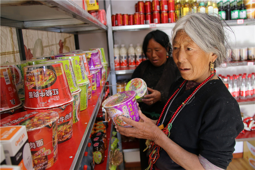 貨架上的貨物琳瑯滿目,價格與縣城大超市一分不差,還節(jié)省了路途奔波。“家門口就能買到東西,還又好又便宜,安逸。開展精準(zhǔn)扶貧,硬是為大家解決了大困難?!?村民格瑪拉措道出了村民們的感激。大家共同商議決定把這超市叫做“洛蝦村感恩超市”。