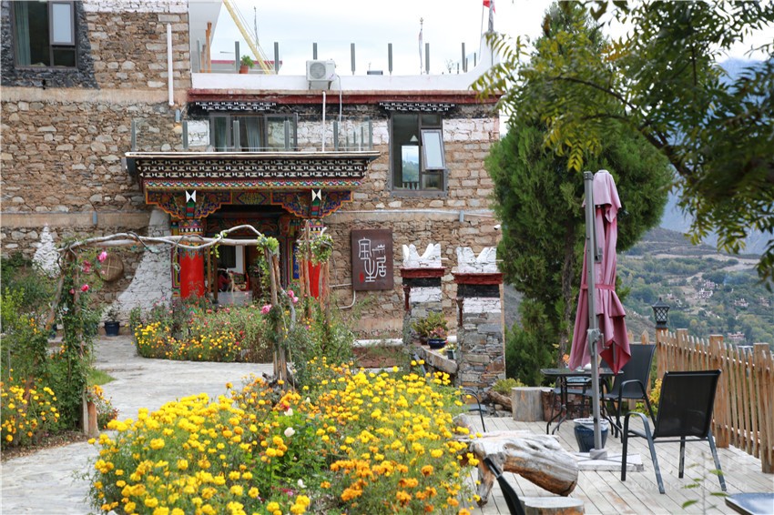 劉國芳告訴記者,花筑田園酒店的誕生,源于她的兒子和廣東東莞幾名游客的一段佳話,兒子安俊杰在跑成都到亞丁包車業(yè)務(wù)的時候,認識了包車到亞丁的東莞游客趙雯、常妹、千麗、雙燕和成都的峰哥,一路上,開朗的安俊杰博得了客人的信任和好感。安俊杰邀請她們到甲居藏寨作客。幾位客人到甲居考察后,立即表示愿意投資在聶呷鄉(xiāng)開辦鄉(xiāng)村酒店。劉國芳請示縣鄉(xiāng)領(lǐng)導(dǎo)同意,決定將自己的自留地拿出來合資開辦酒店。5位客人立即出資10萬元用于整修道路,隨后出資100萬元,于2016年按照鄉(xiāng)村酒店的標準開始修建花筑田園酒店。酒店共有18個房間,建筑突出了丹巴嘉絨風(fēng)格,以玫瑰、菊花、薰衣草等花卉為主,集觀賞、休閑、康養(yǎng)為一體,增強了游客的體驗度和舒適感。2018年5月酒店開門迎客,到今年10月已盈利50多萬元。