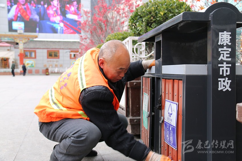 康定的街頭,在匆忙的人群中,那些身著橘黃色保潔服的環(huán)衛(wèi)工人隨處可見。在溜溜城步行街,他們揮動著掃帚,掃起果皮、紙屑;在情歌廣場,他們拿著抹布一遍一遍地擦拭著垃圾桶;在彩虹橋垃圾收集站點,他們將垃圾桶里的垃圾裝上壓縮車,運往垃圾處理廠……