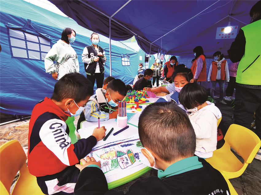 “這頂帳篷中充滿了孩子們的歡聲笑語,這在地震災(zāi)區(qū)就是最動聽的聲音。”共青團甘孜州委統(tǒng)戰(zhàn)社會聯(lián)絡(luò)部部長澤仁娜姆介紹,地震發(fā)生后,團州委第一時間組織3193名志愿者,24支青年突擊隊參與應(yīng)急志愿者工作,并在磨西鎮(zhèn)貢嘎廣場分配38名志愿者參與后勤保障工作,其中5個人便成為了“青青兒童樂園”里的“保育員”,“孩子們可以在這里畫畫、做游戲,還能在老師輔導(dǎo)下學習,他們不安的情緒也得到安撫,臉上的恐懼也逐漸被微笑取代。”