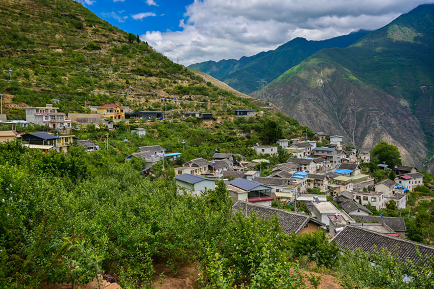 仲夏時(shí)節(jié),漫步在藍(lán)天白云下的黃草坪村,一個(gè)個(gè)雞蛋大小的蘋果、枇杷掛滿枝頭,撲面而來的果香味沁人心田。放眼望去,山谷間一團(tuán)團(tuán)云霧纏繞在大山峭壁間,山腳下,大渡河猶如一條青色的綢緞,歡騰的河水正述說如今黃草坪村的幸福生活。