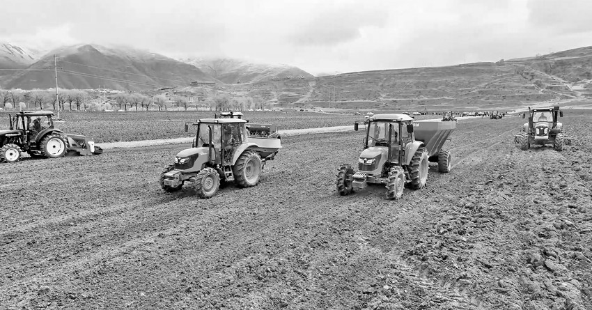 在甘孜縣圣康田園綜合體3900余畝的青稞地里,機(jī)器轟鳴、人流涌動(dòng),拖拉機(jī)、液壓翻轉(zhuǎn)犁、撒肥機(jī)、聯(lián)合重耙、播種機(jī)等先進(jìn)農(nóng)業(yè)科技裝備紛紛亮相,翻耕、播種和施肥等一氣呵成。