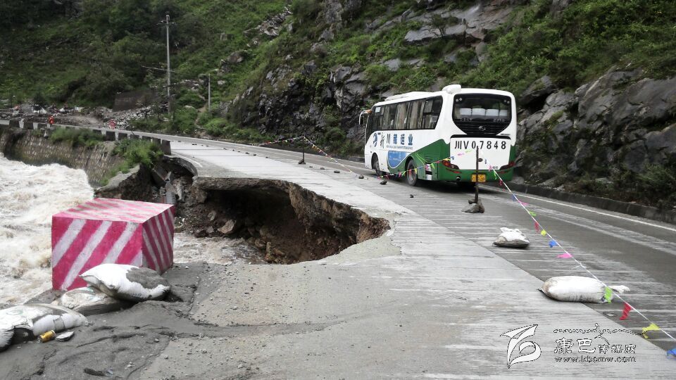 本網訊 (鄧翰卿 賀淑明文/圖)由于連降暴雨,折多河暴發(fā)山洪。9月17日上午7時20分,瀘定公路分局瓦斯溝養(yǎng)護站在道路巡查中發(fā)現國道318線二康路小天都路段K2824+800處路基被山洪沖毀,形成缺口。發(fā)現險情后,該分局第一時間組織人員對危險路段實行交通管制,安排專人負責在缺口上、下方向提示過往行人及車輛,并及時擬定應急搶險方案。截止目前,路基右側被沖毀路段長達45米,寬5.9米,路基被水漩空,道路混凝土面層懸空15米,僅左側車道勉強通行。因水流湍急,不利于及時恢復路基,目前該路段已實行交通管制,該分局提示過往車輛觀察、緩慢通行水毀路段。