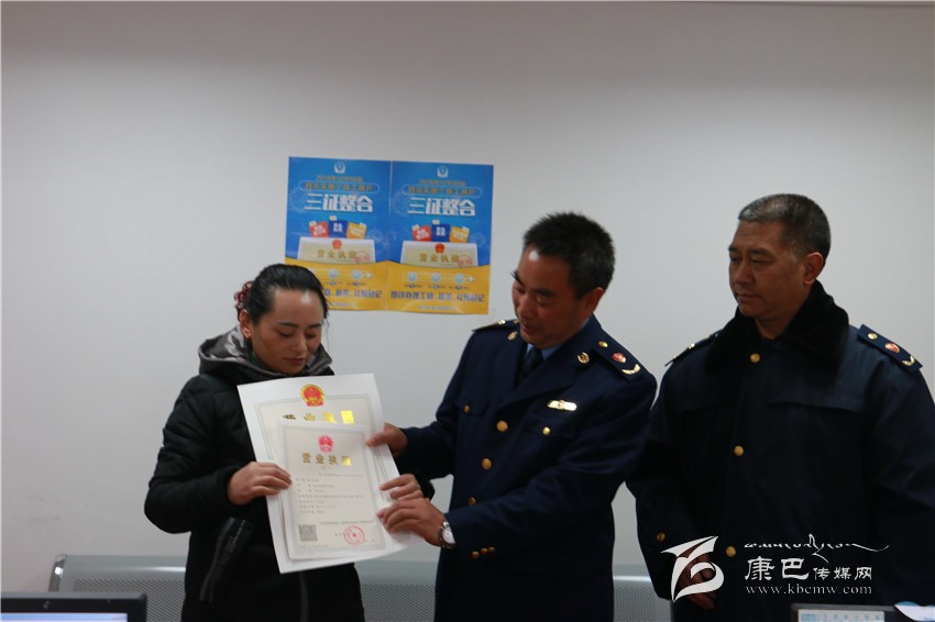 本網(wǎng)訊(迎春 文/圖)12月1日上午,我州首張個體工商戶“三證整合”營業(yè)執(zhí)照在康定市食藥工商局工商所辦證窗口,由州工商局副局長席小康和康定市食藥工質(zhì)局局長楊永勝一同,把新版?zhèn)€體工商戶“三證整合”營業(yè)執(zhí)照發(fā)放到個體工商戶張春碧手中。首發(fā)個體工商戶“三證整合”營業(yè)執(zhí)照拉開了我州個體工商戶“三證整合”登記的帷幕。今后,公民只需填寫“一張表”,向“一個窗口”提交“一套材料”即可辦理個體工商戶、稅務(wù)登記及社會保險登記。截止12月1日12點(diǎn),我州共計發(fā)放個體工商戶“三證合整”新版營業(yè)執(zhí)照15份。